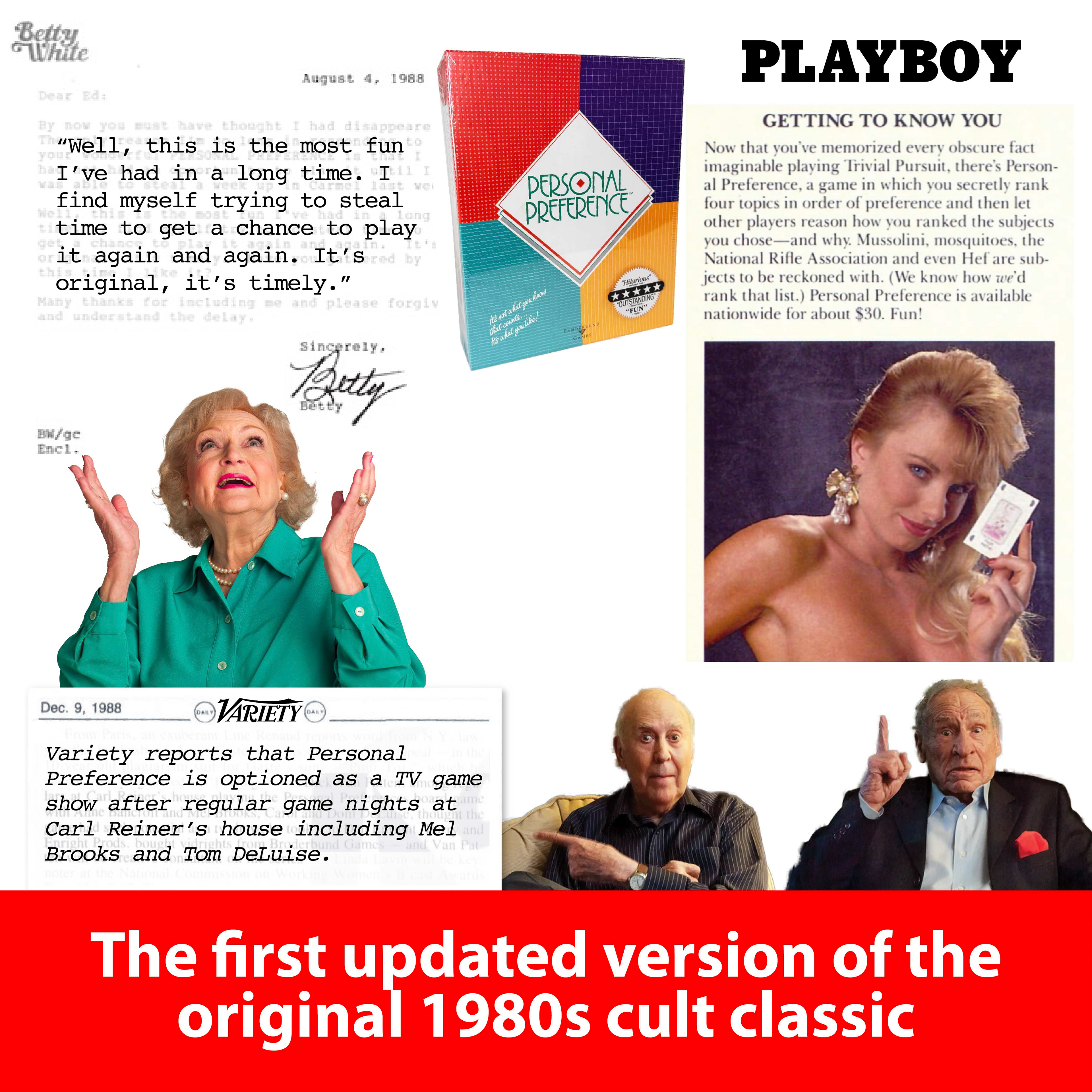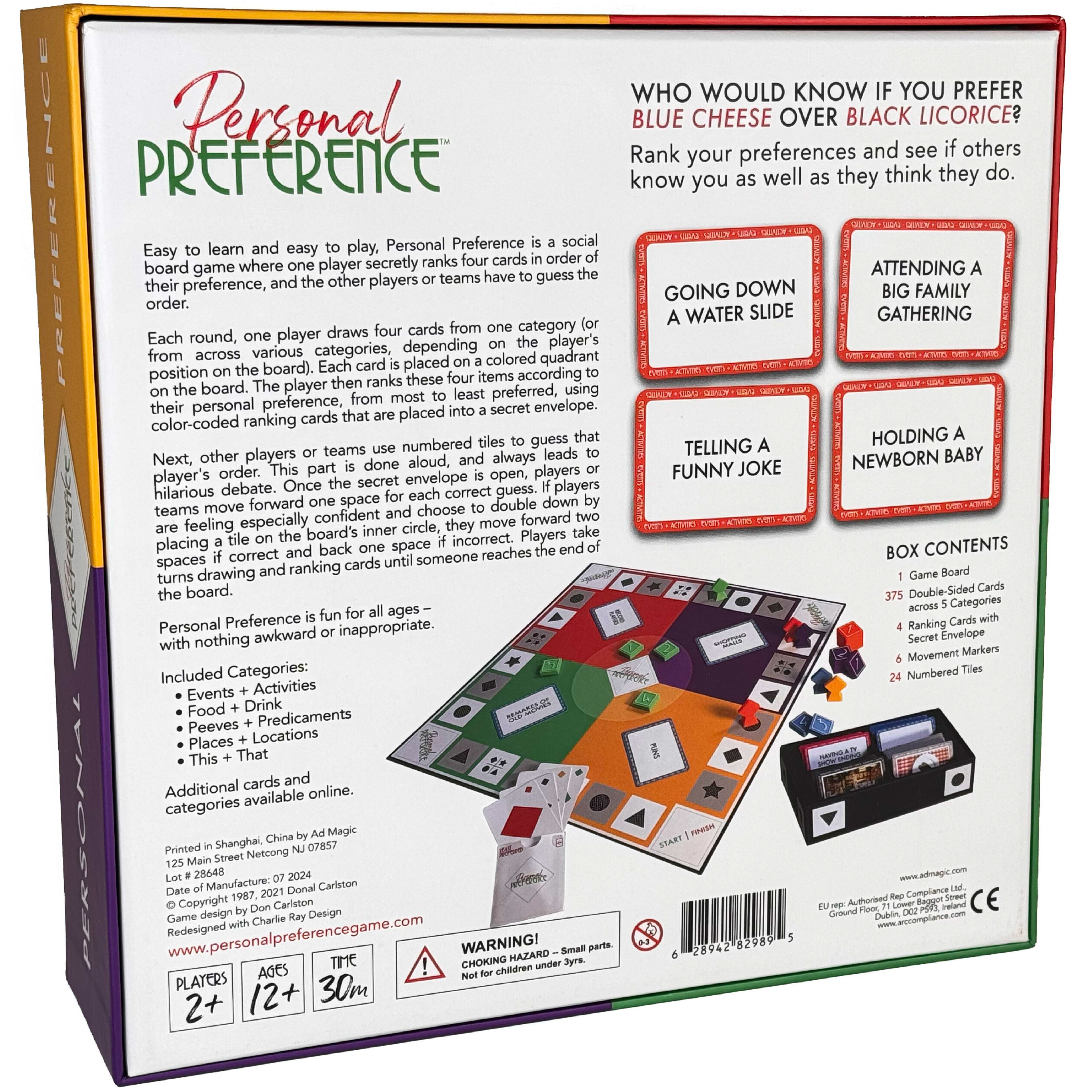 An update on the wildly popular 1980's 'how well do you really know each other?' party game, by original creator Don Carlston. Easy to learn and easy to play, Personal Preference is a social board game where one player secretly ranks four cards in order of their preference, and the other players or teams have to guess the order.